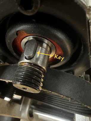 Remove the left-hand nut, rotate the cutterhead so that the keyway is facing up, place the key in the keyway, and slide the pulley onto the shaft and over the keyway, then replace nut and tighten. Note that if you use the new nut that came with the helical cutterhead, it may not be the same size as the original (this one was 24mm instead of the 22mm original). The photo shows the key in the keyway just prior to replacing the pulley.